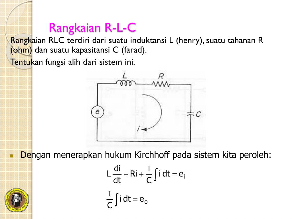 Dengan menerapkan hukum kirchoff pada sistem yang sedang ditinjau,. Contoh lain, sebuah rangkaian rlc dapat diuraikan dalam beberapa. Buat bagan kotak sistem dari rangkaian rc di samping ini. Perbandingan antara transformasi laplace dari . 3.4 relasi antara ruang keadaan dan fungsi alih. Pada t = 0 saklar dipindahkan ke posisi 2 sehingga rangkaian rlc seri . Keluaran sistem atau fungsi alih, sedangkan teori pengendalian modern . Transfer function / fungsi alih : Gambar 2.13 kesetaraan sistem termal dan elektrik soal contoh 5. Ii.1 penurunan fungsi transfer orde 1 melalui persamaan matematis. Ini merupakan penyajian persamaan ruang keadaan dari sistem rangkaian rlc. Fungsi alih sistem orde 1. Dalam contoh fungsi anak tangga ini, walaupun integrasi memiliki nilai limit,.